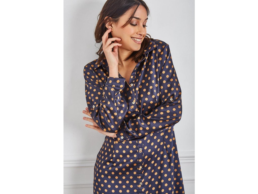 Košeľové maxi šaty v tmavomodrej farbe so zlatými bodkami